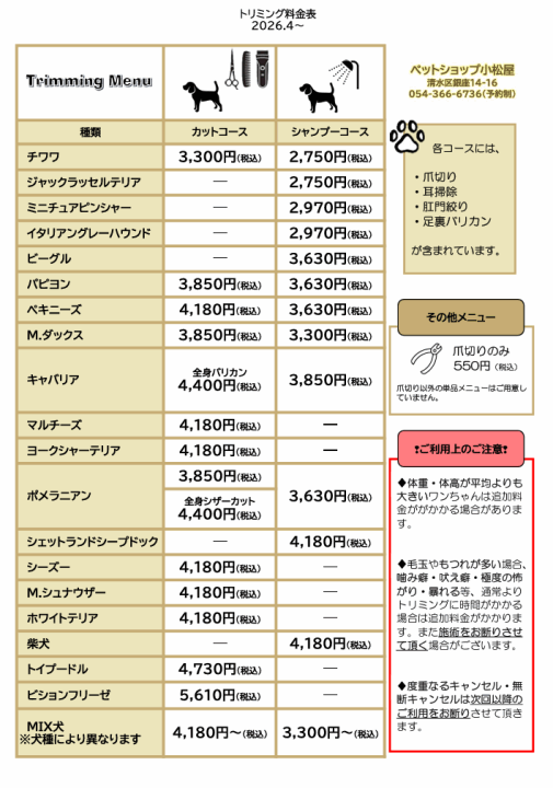 トリミング料金表